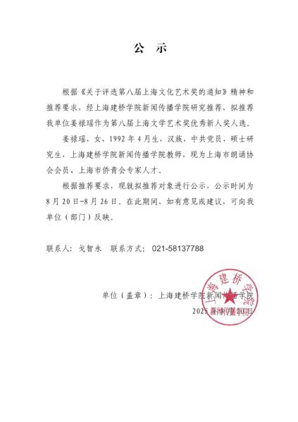 关于推荐姜禄瑶作为第八届上海文学艺术奖优秀新人奖人选公示