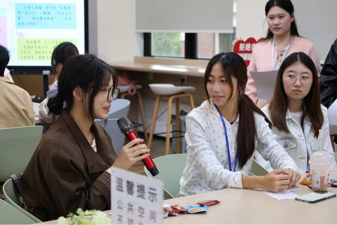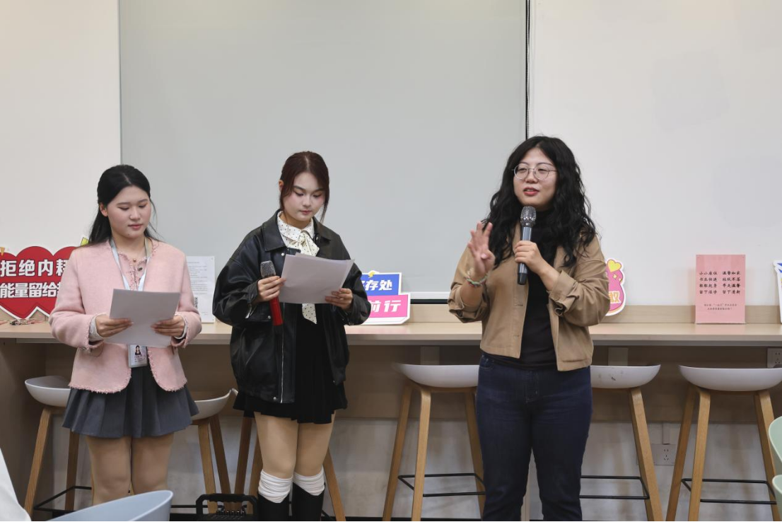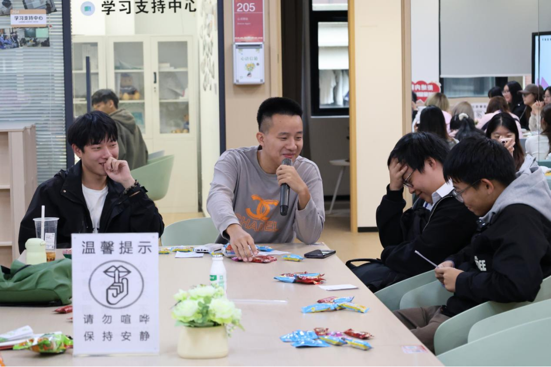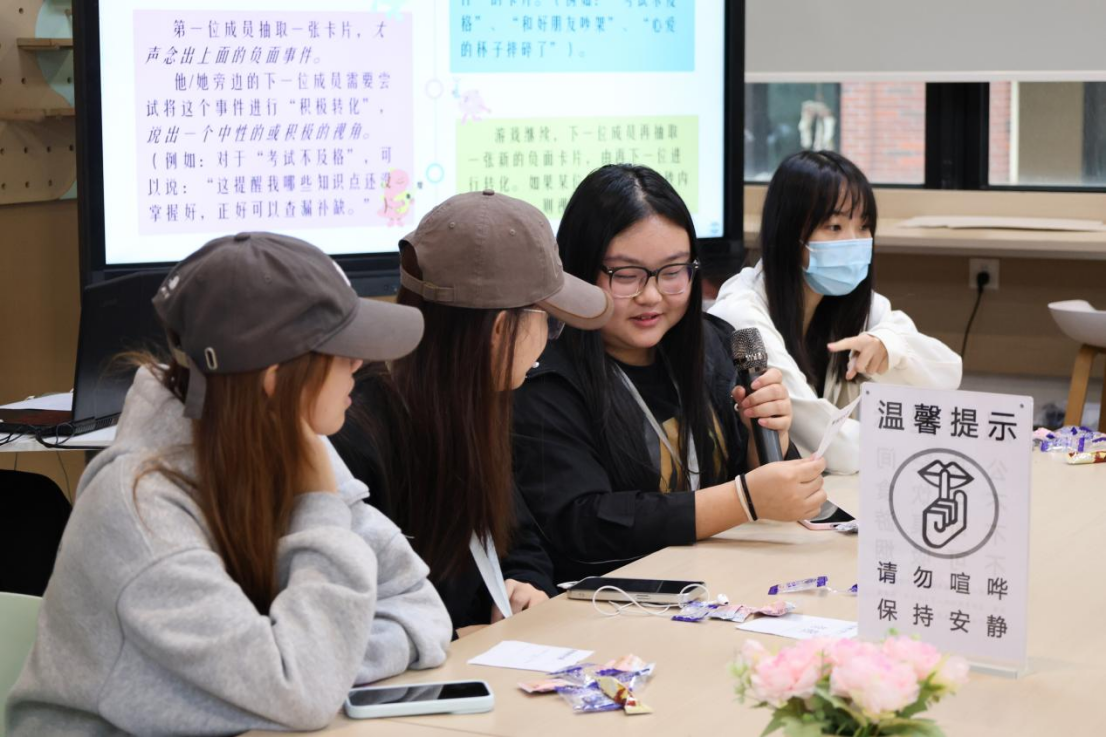 在“情绪温度计”游戏中,成员抽取情绪词汇卡片,仅凭与“身体感受”相关的提问猜测情绪类型,在问答过程中增强了对情绪的觉察与表达能力;“积极转化器”游戏中,大家围绕“考试不及格”“与好友吵架”等负面事件,迅速转换视角,给出积极解读,锻炼了正向思维与共情能力;“我们的故事接龙”环节中,以小组为单位,围绕指定情绪词编织完整故事,既考验团队协作与倾听能力,也让成员在创意碰撞中感受情绪的多元表达。游戏中的惩罚环节设计巧妙,“收获一个赞美”“说出感谢”“我欣赏你”等正向任务,使“小失败”成为传递温暖与认可的契机,进一步强化了朋辈联结。