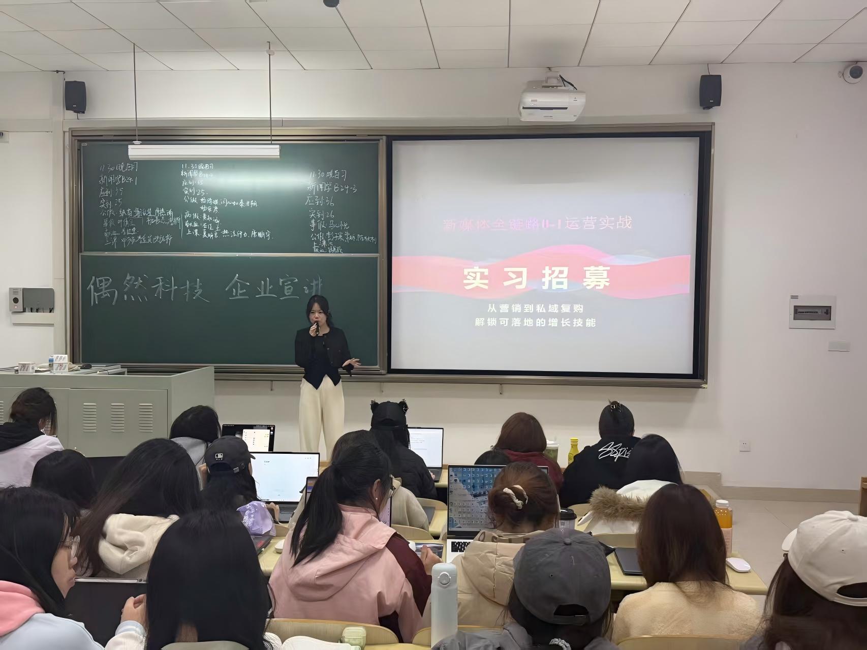 上海偶然网络科技有限公司成立于2019年12月,该公司聚焦网络科技、新媒体运营基AI+教育等领域,业务涵盖技术服务、品牌设计、电商运营等。宣讲伊始,现场同学们展现出对实习项目的高度关注和求职热情。
