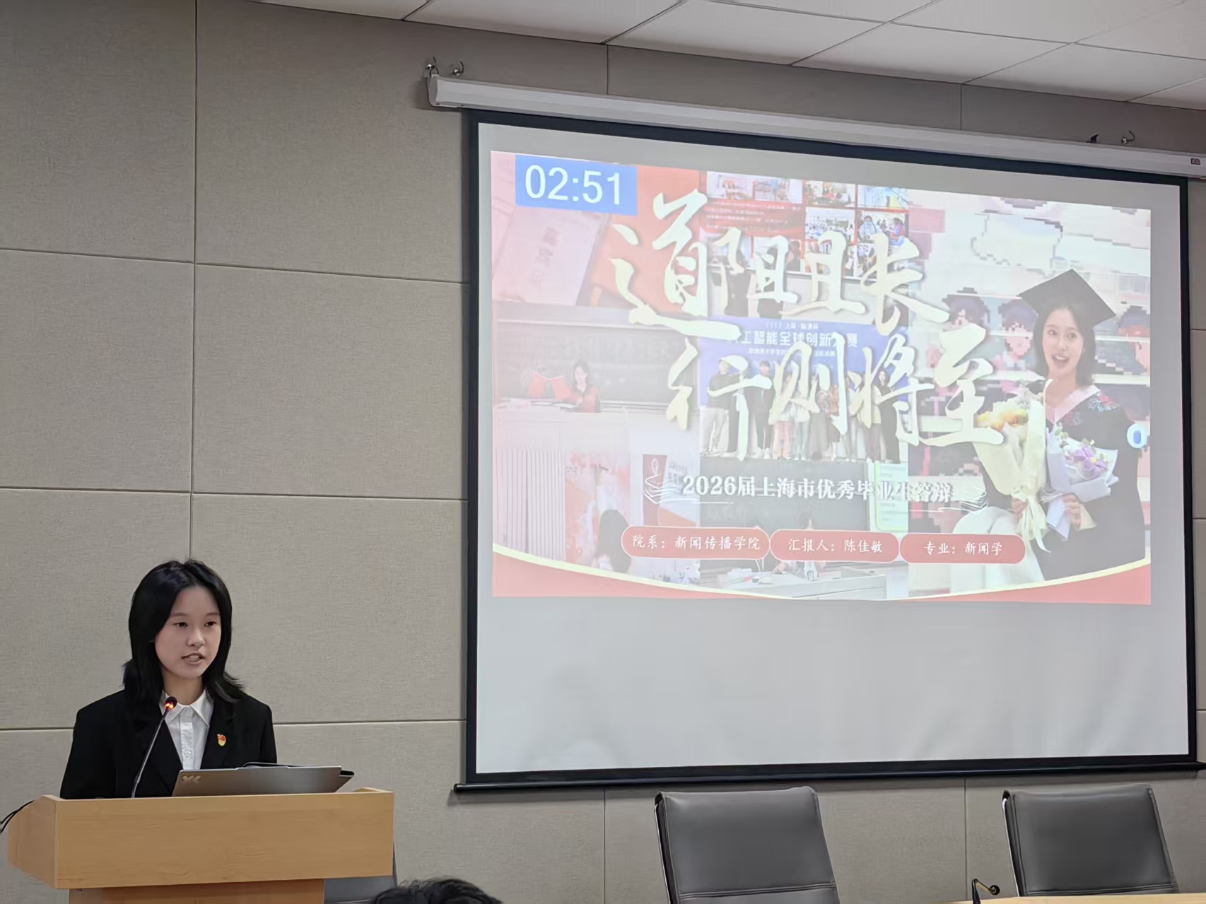 为切实做好优秀毕业生评选工作,充分发挥榜样引领作用,3月24日下午,新闻传播学院在新闻308会议室举行2026届上海市优秀毕业生答辩评审会。学院党委副书记吴成皓,专业教师代表以及全体辅导员共同担任评委,45名候选人参加答辩。