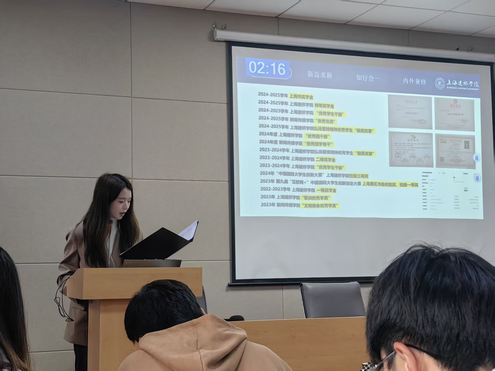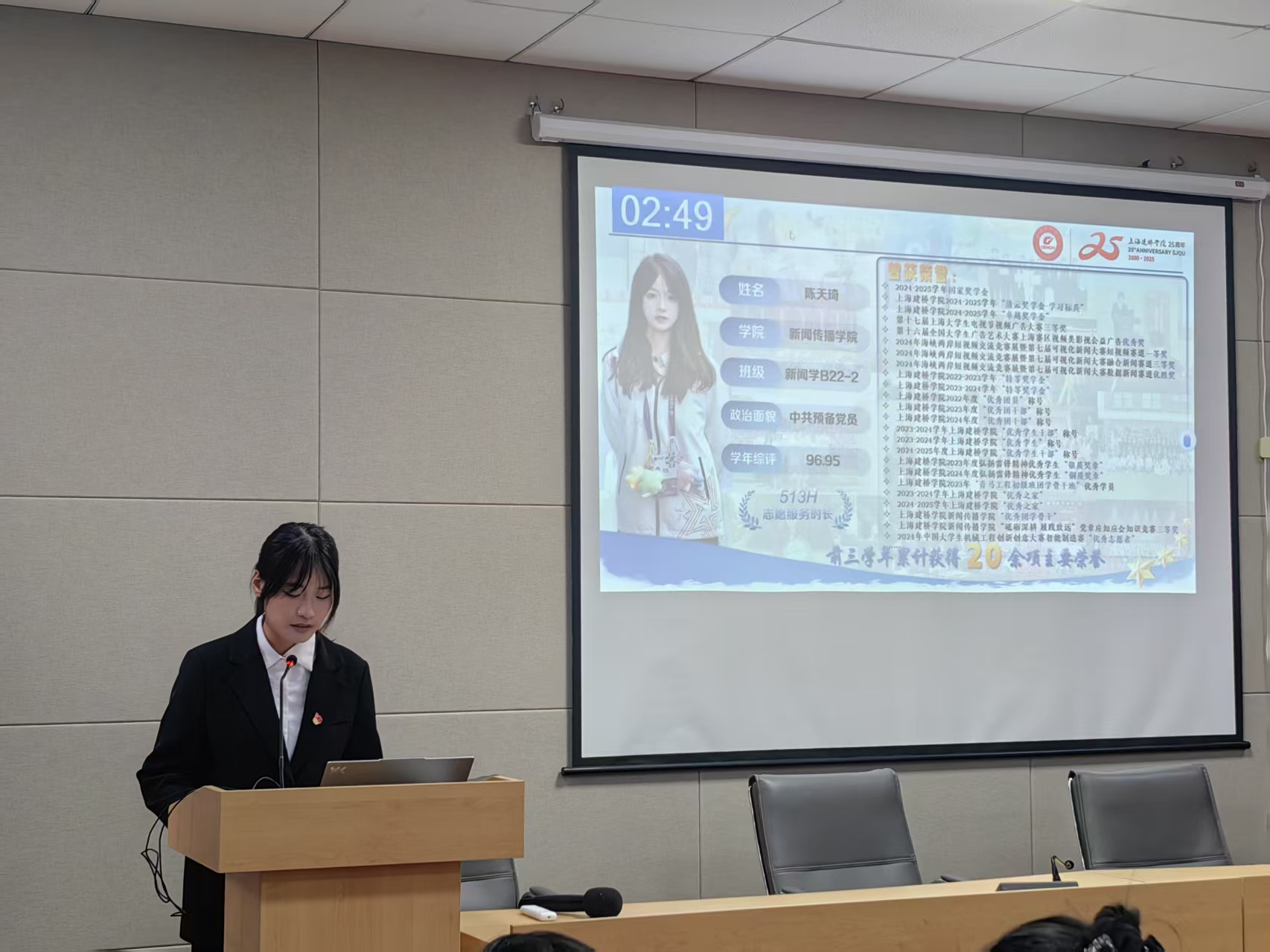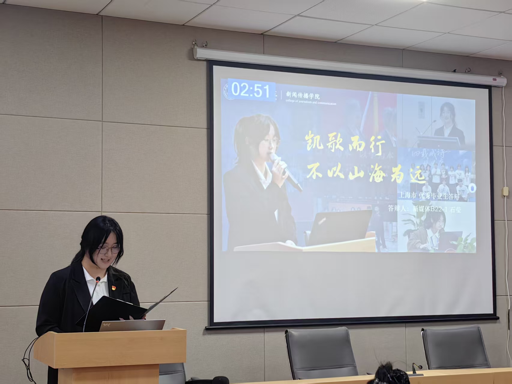 答辩现场,候选人依次登台,围绕思想品德、学业成绩、科研创新、社会实践、志愿服务等方面进行陈述,全面展示大学期间的成长与收获。同学们或分享在专业领域的深耕探索,或讲述投身基层实践的感人经历,或回顾服务同学的点点滴滴,充分展现了新闻学子扎实的专业素养、昂扬的精神风貌和强烈的社会责任感。