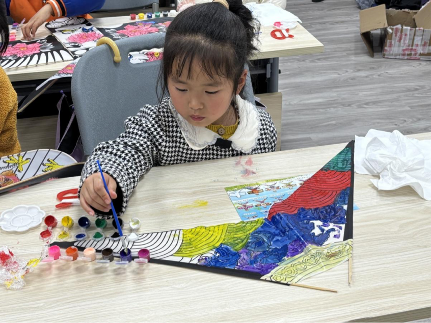 同学们不仅手把手指导孩子们开展风筝骨架拼接、风筝面粘贴等制作步骤,还细致讲解涂色技巧,鼓励孩子们充分发挥想象力,将红色元素、党史符号等融入纸鸢设计。在场家长积极主动参与协作,大家在制作纸鸢的过程中,认真倾听大学生讲述党史小故事,在互动交流中深切感受红色文化的独特魅力。小朋友们以笔为媒勾勒色彩,以行动传递热爱。很快,一个个色彩鲜艳、童趣盎然的纸鸢制作完成,每一只纸鸢都承载着孩子们的美好心愿和对党的纯真向往。