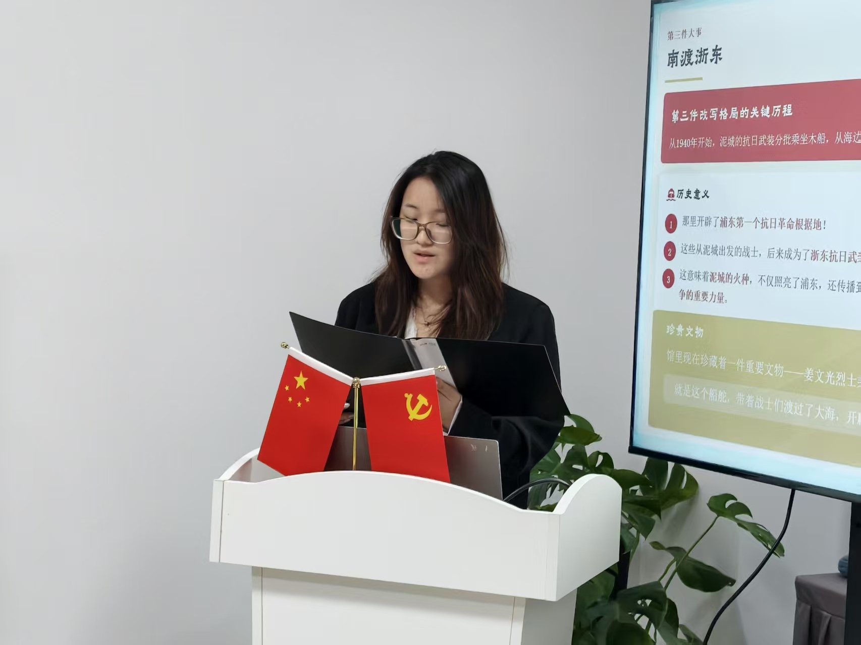 第一组重点介绍了红色泥城主题馆的整体概况与历史脉络。场馆以多个主题篇章展现泥城革命发展历程,并通过现代科技手段增强沉浸体验。同时,第一组通过梳理泥城暴动、汇角战斗、南渡浙东等重要历史事件,展现革命先辈在艰难环境中坚定信仰、英勇斗争的精神。