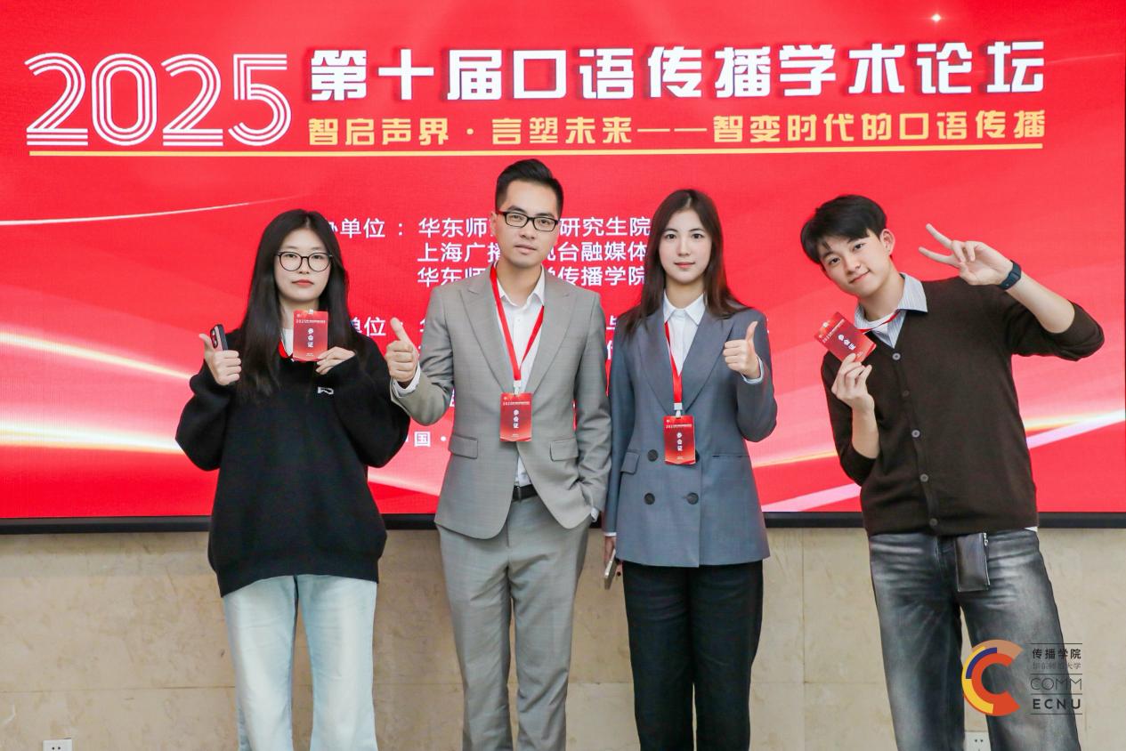 图为陈婧(左一)与专业老师一起参加传媒学术论坛