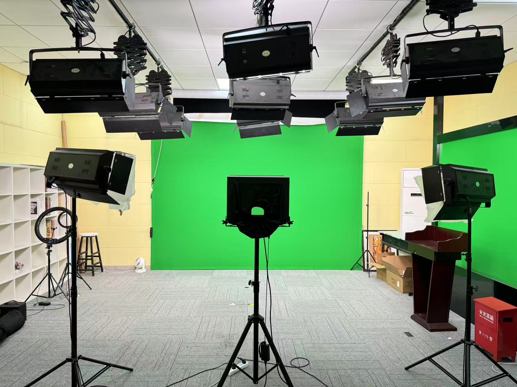 实训室依托校企协同优势,打造功能完备的实训空间,可容纳15名学生开展实训,适配多场景教学需求。室内配备全套专业设备:摄影灯光可精准调控,保障画面质感;标准绿背景支持虚拟场景合成,满足多元创作;三脚架提供稳定支撑,搭配提词器提升课程录制、直播播报的专业性,帮助学子夯实专业基础。