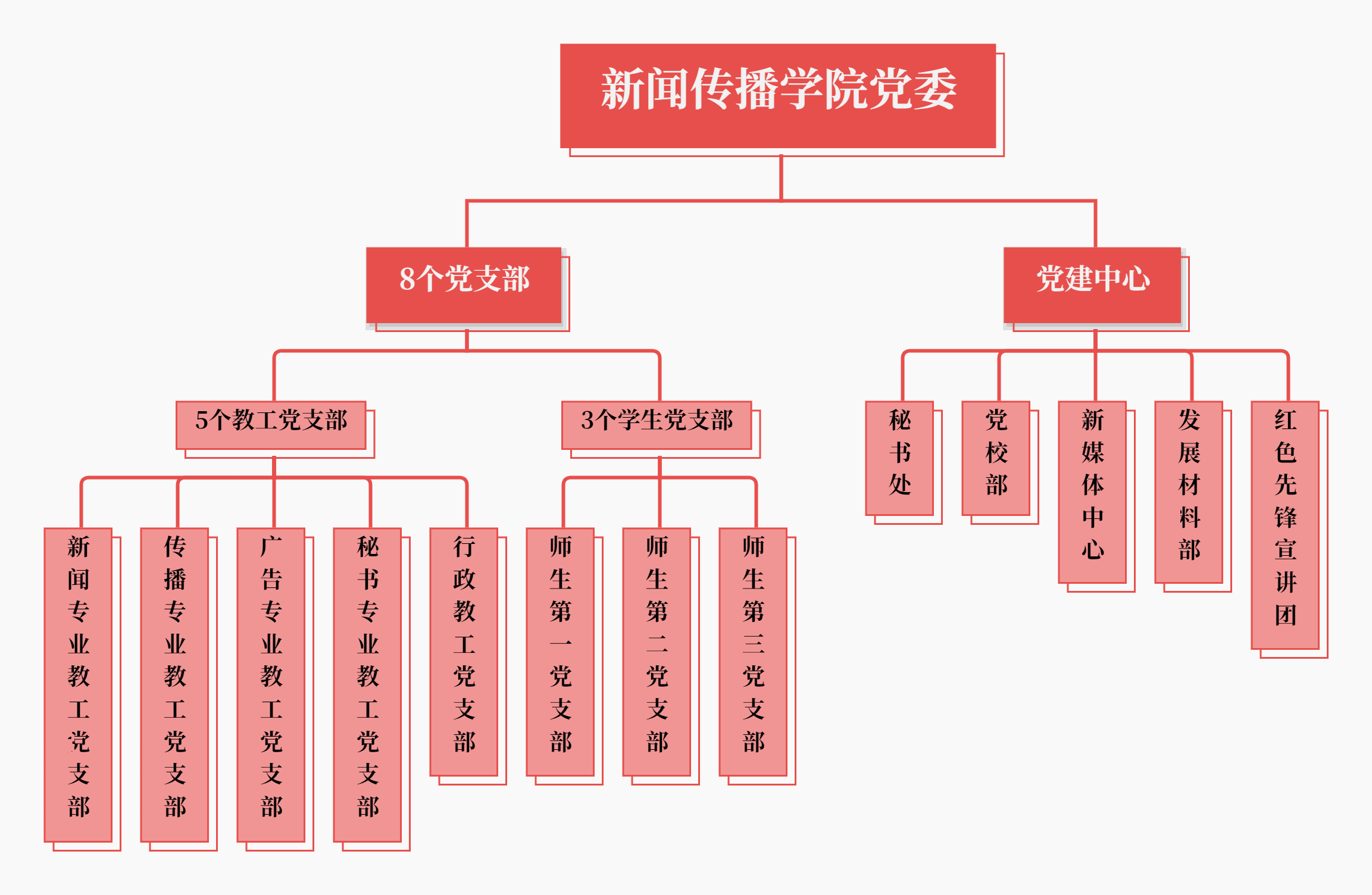 中共上海建桥学院新闻传播学院委员会现下设8个党支部,其中教工党支部5个,学生党支部3个。学院党委班子由七名委员组成,分别是: